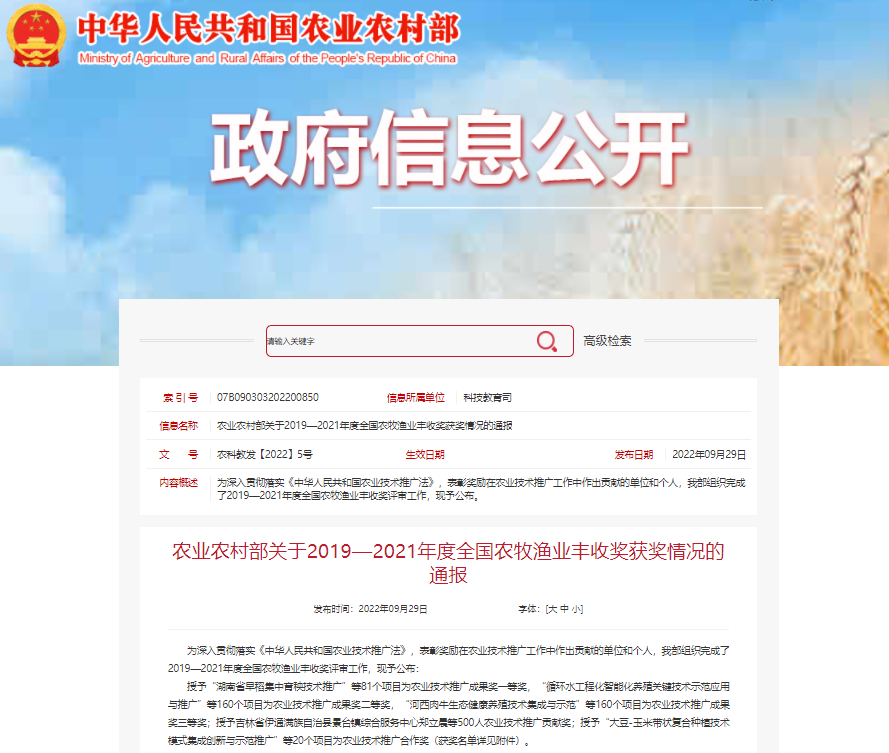 9月29日,農(nóng)業(yè)農(nóng)村部官網(wǎng)通報了“2019-2021年度全國農(nóng)牧漁業(yè)豐收獎”獲獎名單,中國農(nóng)科院植保所中保集團陳昶團隊的“植物免疫誘抗劑阿泰靈應(yīng)用技術(shù)體系的構(gòu)建及推廣應(yīng)用”項目,榮獲農(nóng)業(yè)技術(shù)推廣成果獎一等獎。