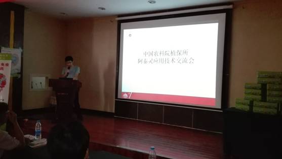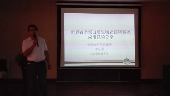 技術(shù)推廣老師梁增浩向與會的經(jīng)銷商介紹了“阿泰靈”作為世界第一個植物免疫蛋白質(zhì)生物農(nóng)藥的創(chuàng)制發(fā)展史,讓大家了解到“阿泰靈”發(fā)展的每一步艱辛歷程都凝聚了植保所和中保集團(tuán)科研人員、技術(shù)推廣團(tuán)隊的心血和汗水,所有的心甘情愿的付出都是為了實現(xiàn)給廣大百姓帶來一個真正的好產(chǎn)品,一個可以根本解決作物防效問題的好農(nóng)藥。梁老師的真情講解,得到了與會人員理解和認(rèn)可的掌聲。