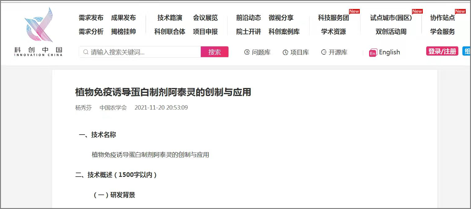 植物免疫誘導(dǎo)蛋白制劑阿泰靈的創(chuàng)制與應(yīng)用”得到評(píng)審專家的認(rèn)可,成功入選并入駐“科創(chuàng)中國(guó)” ...全文分類[ 中保新聞 ] 2021-12-17